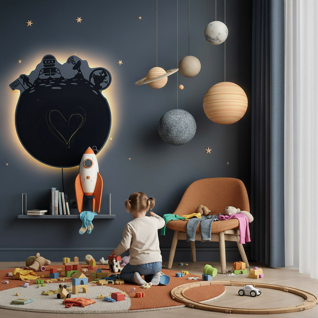 Tablă decorativă cu suprafață magnetică și lumină caldă, ideală pentru camerele copiilor.